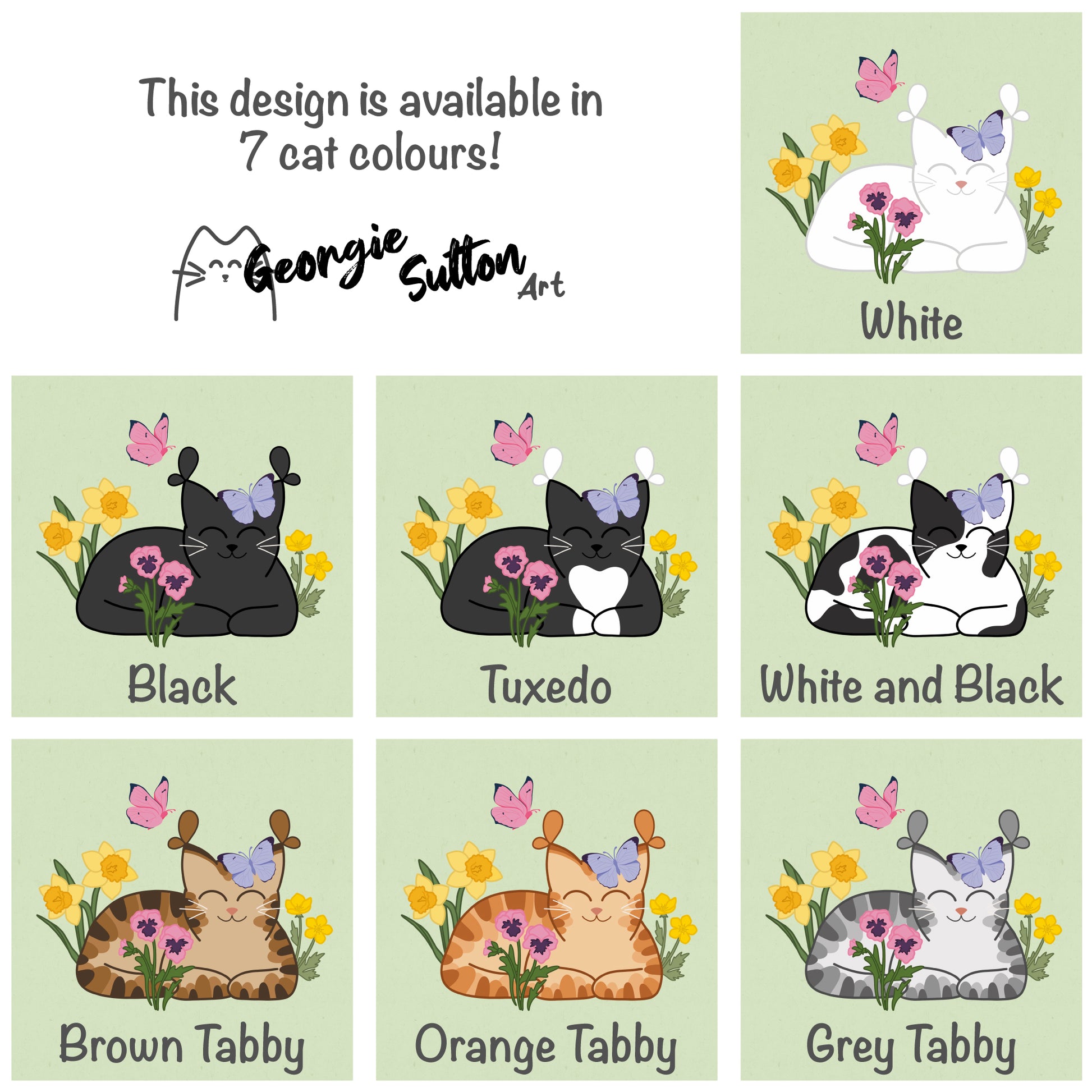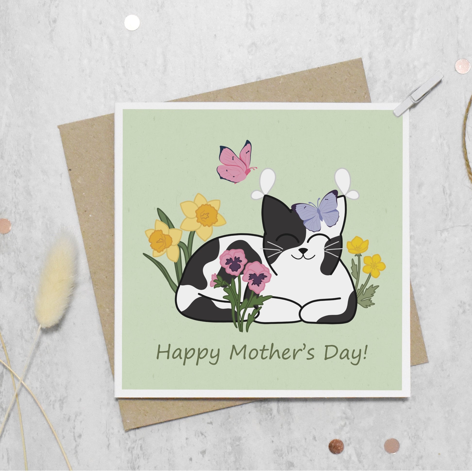 This card has been designed by myself from an original digital painting. The design features a cat and surrounded by spring flowers and butterflies. This will make a perfect Mother's Day card for Mum, Nan or another special woman who deserves celebrating!