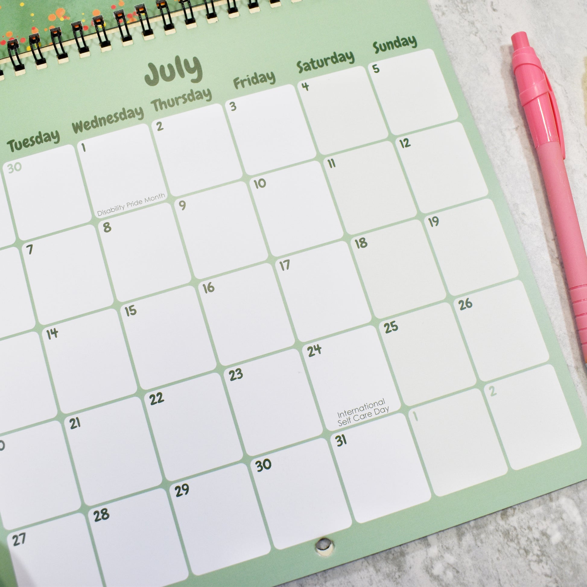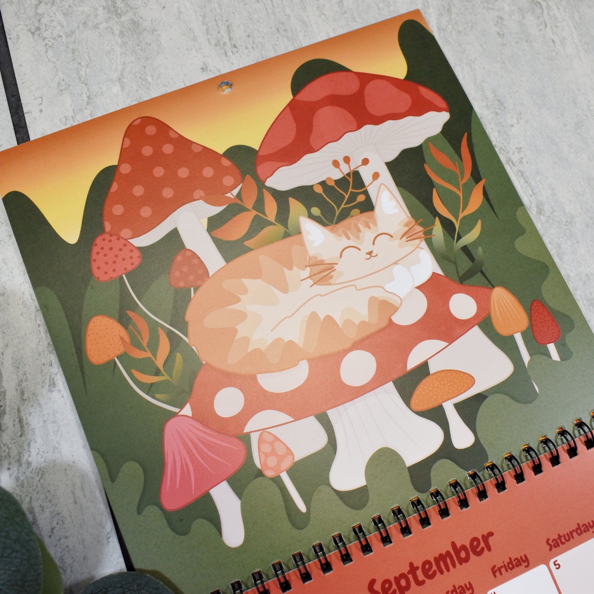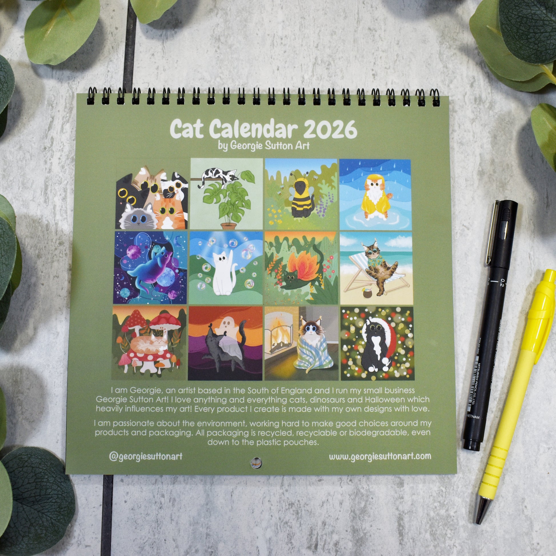 This cat calendar will add a touch of colour to you wall through the year of 2026! The calendar features 12 original illustrations for each month on the top page, with the dates at the bottom.