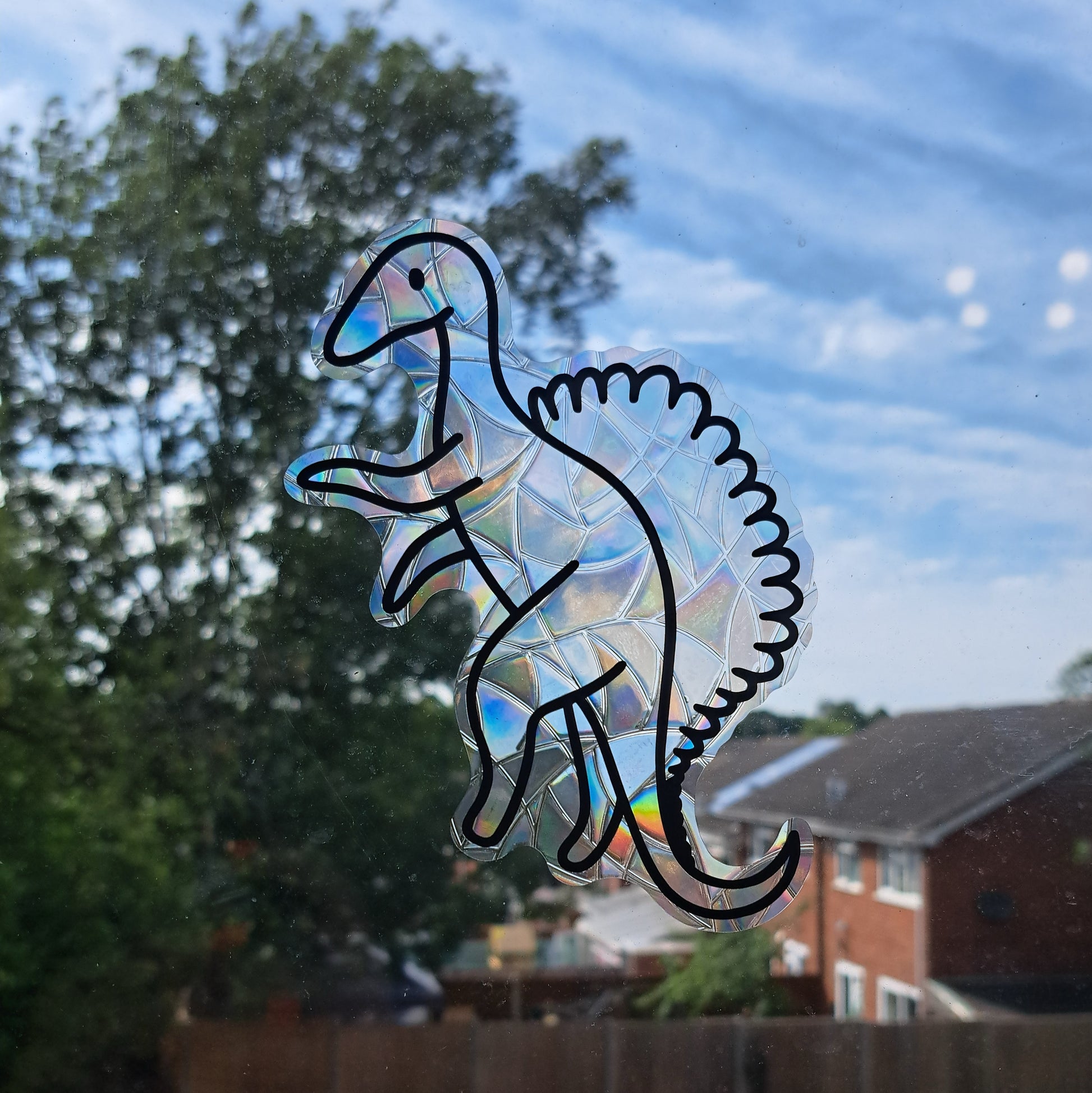 These dinosaur window stickers make rainbows when placed in sunny windows.