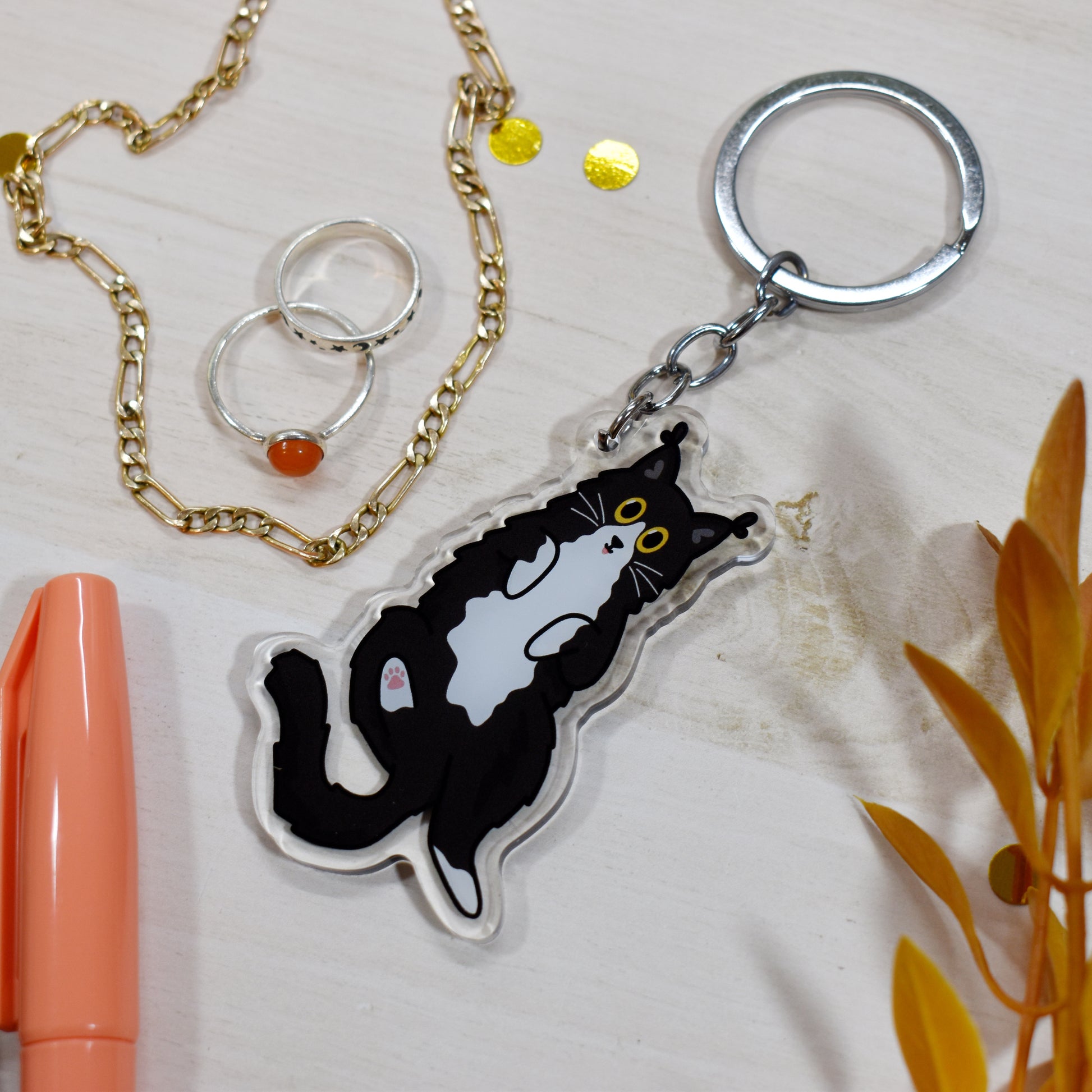 The keyring has been designed by myself. The design features a little fluffy tuxedo cat on its back.